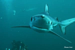 We were told that we would have to wait for about two sharks to turn up before we got in the water as there is no point getting in for just one shark. Suddenly a second blue shark showed up and the briefing was started, we were told that they had never before done a blue shark dive with dolphins, so this would be a first for them but they did say that the dolphins might make the dive hard as they may scare the sharks away. As the Briefing was taking place we then heard the words MAKO which meant that a Mako shark was hanging around. These are one of my favourite species as they are the fastest shark that we know of, they are related to the White Shark and look as if they have been made of metal. Unfortunately, the Mako was eventually scared away before we got in but that didn’t ruin the dive that we had.