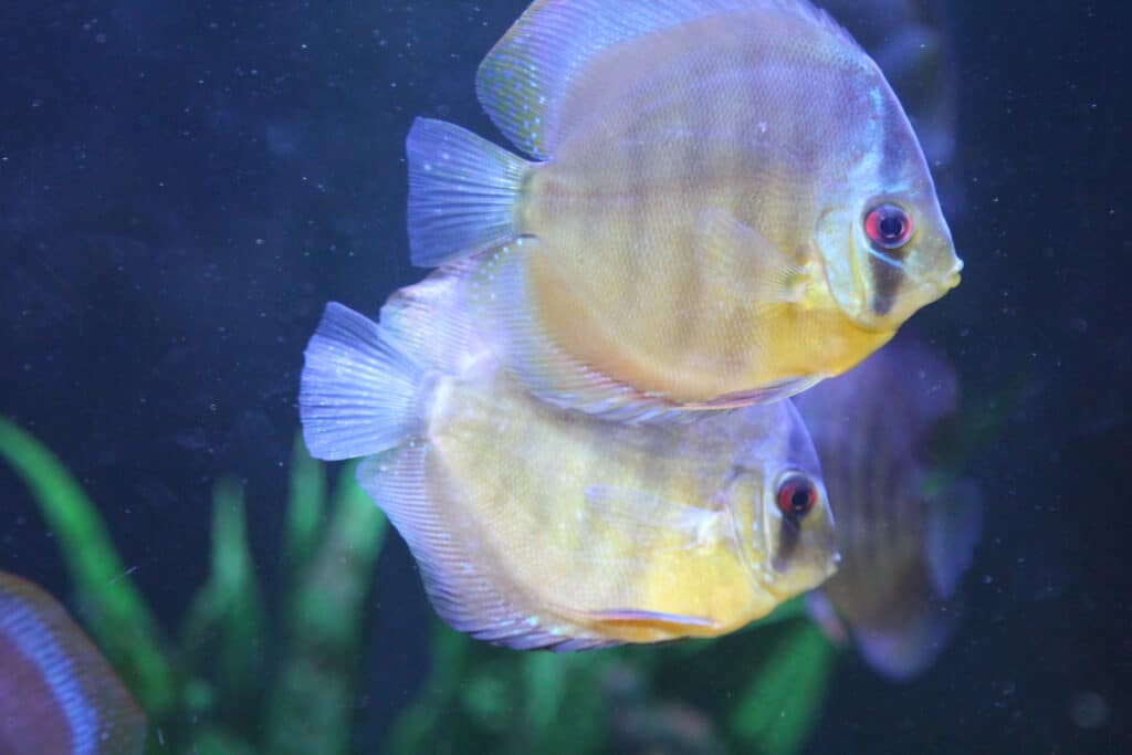 It could also have something to do with the fact that they are considered by fishkeeping hobbyists to be one of the most difficult fish to keep. Here at the Blue Planet Aquarium we have found that our discus love clean water so we exchange 20% of their water every day for fresh, clean dechlorinated water. When old enough to breed, discus ‘pair off’, laying and then sharing the guarding of their eggs until they hatch. Once hatched, for the first couple of weeks of their lives, the young fry feed off the slime coat on their parents’ sides until large enough to eat other food. Unlike most other species of the Cichlid family, Discus enjoy the feeling of being in a large group.