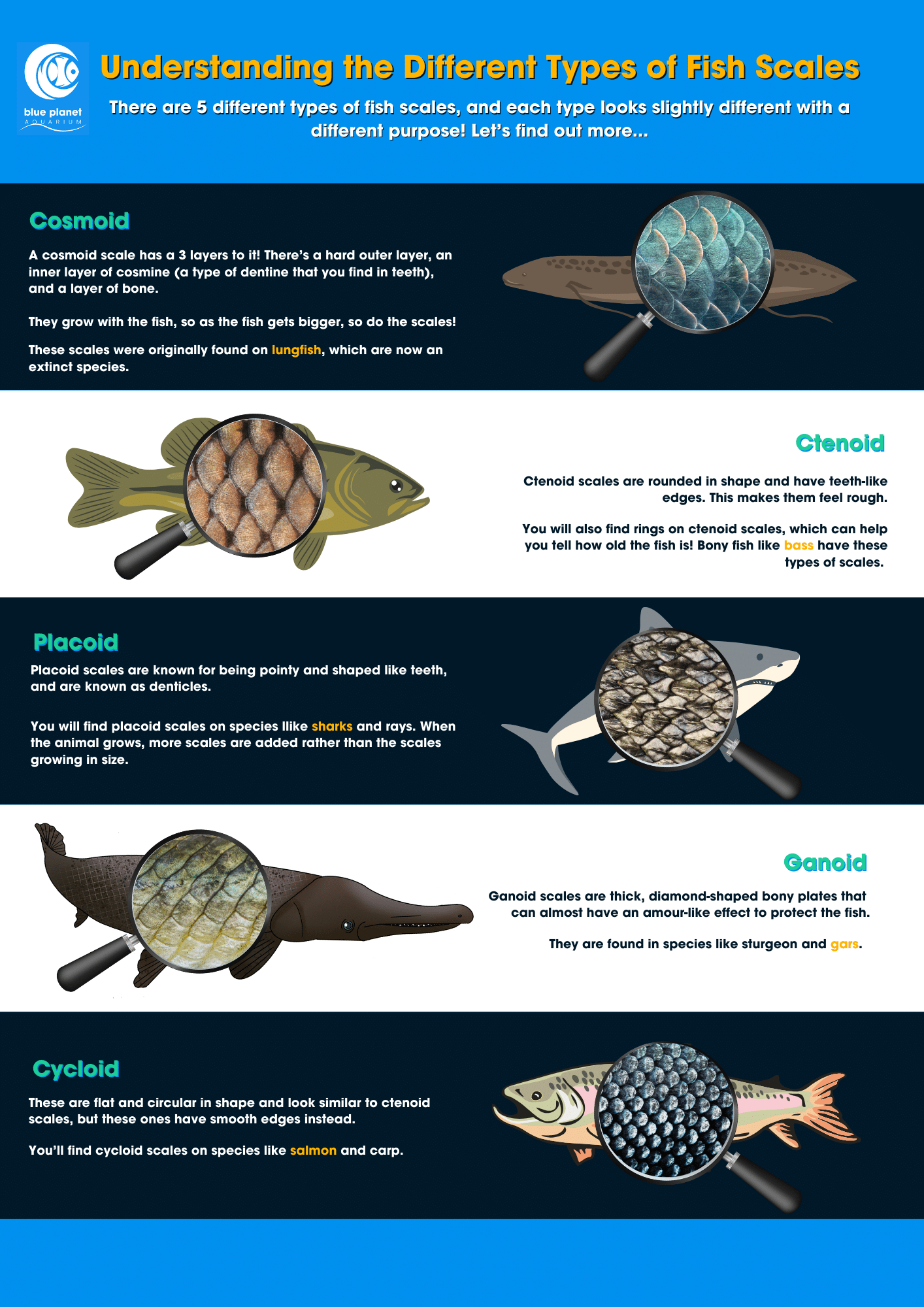 Our exhibits at Blue Planet Aquarium are filled with fish with all the different types of scales in all different colours and sizes. Come along and try to spot the different scale shapes and types for yourself on your next visit!