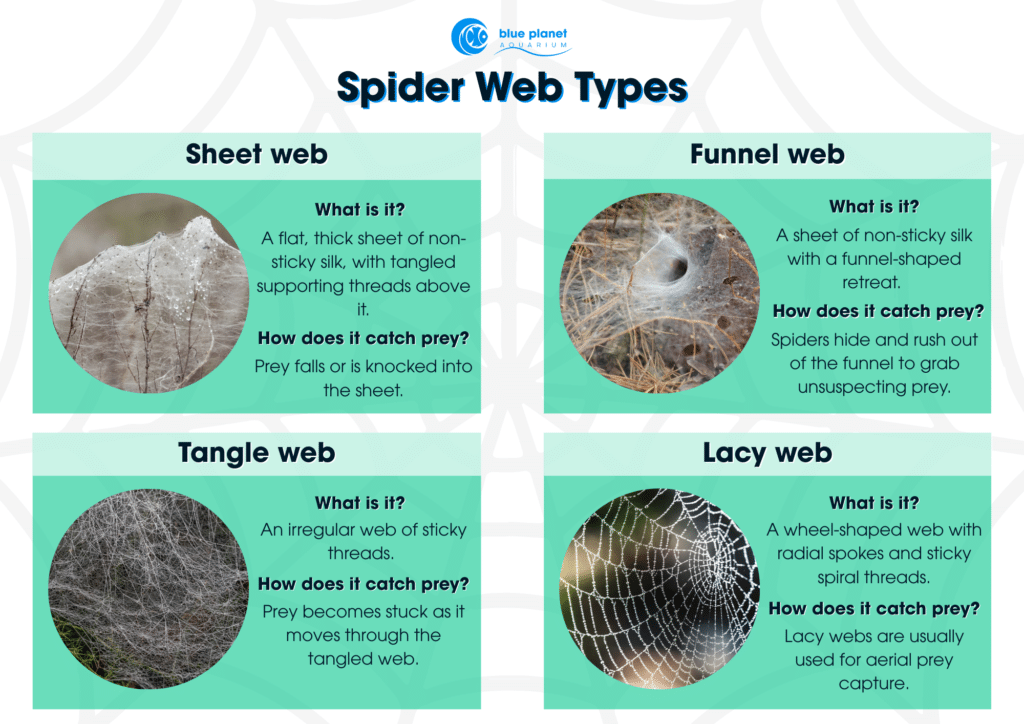 - Sheet webs: Sheet webs are a dense, horizontal layer of silk made by sheet weavers. Insects fall onto the web, where the spider waits underneath to strike.