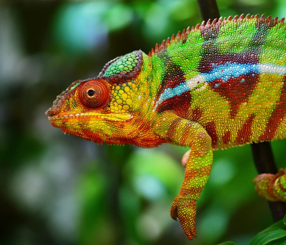 Panther chameleons are native to the lush tropical forests of Madagascar, spending the vast majority of their time high up in trees, where their unique anatomy helps them to cling to branches and blend into their environment.